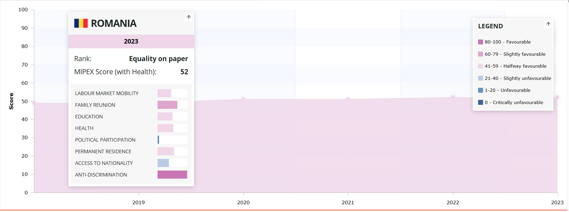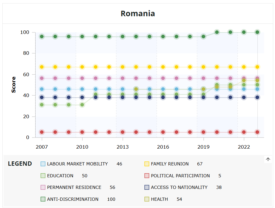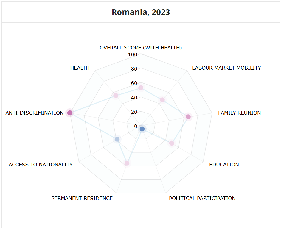- Cel mai mic scor este se înregistrează în ceea ce privește Participarea politică. România are un scor de doar 5/100, clasificat Nefavorabil (unfavourable), care reflectă excluderea aproape generală a imigranților din procesele politice.